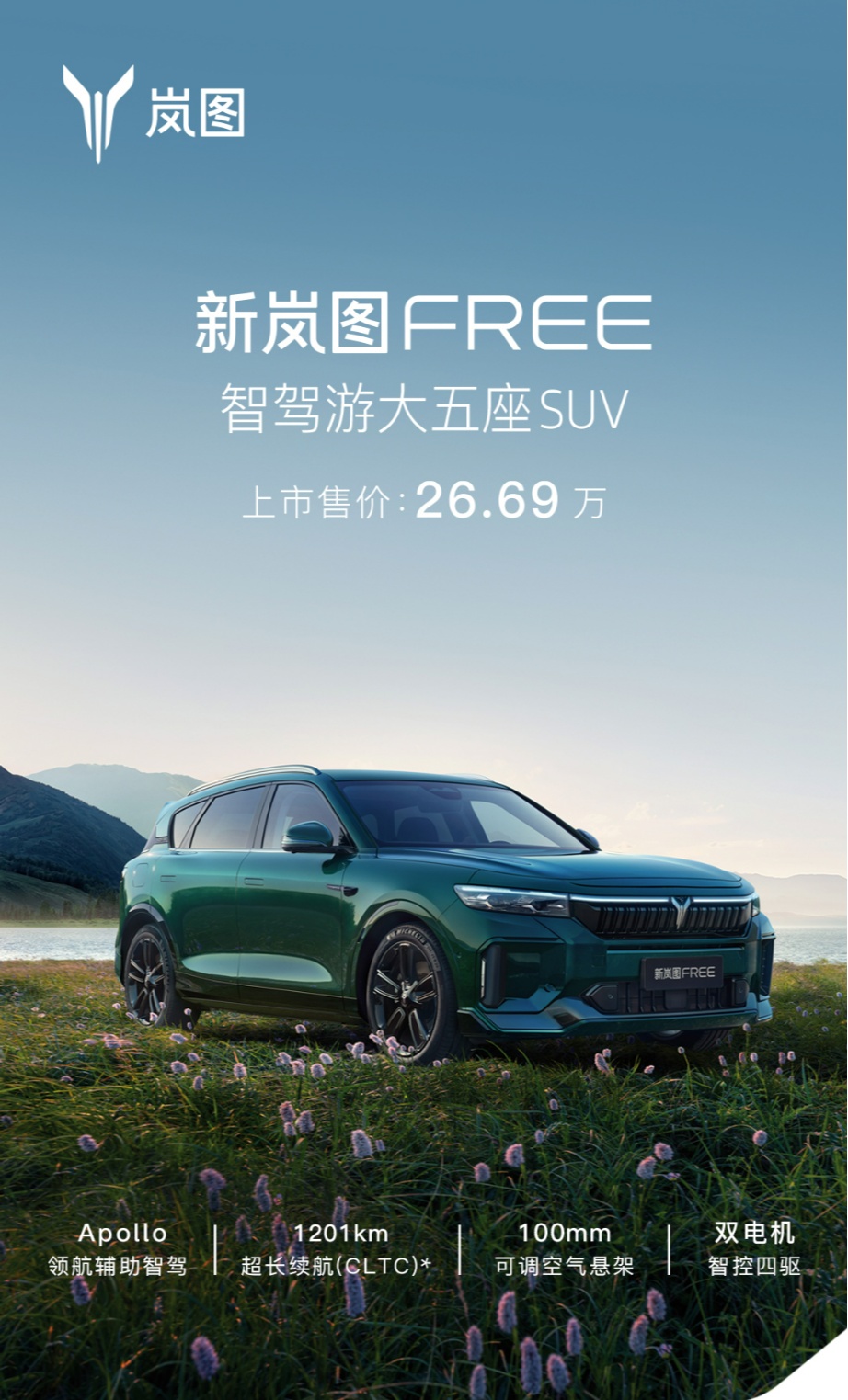 嵐圖汽車(chē)CEO盧放表示,作為“智駕游大五座SUV”,新嵐圖FREE的“智”,代表Apollo Highway Driving Pro領(lǐng)航輔助智駕帶來(lái)的智駕體驗(yàn);“駕”,意味著繼承了嵐圖品牌基因里的駕控實(shí)力;“游”,則是超長(zhǎng)續(xù)航、超低能耗以及豪華配置帶來(lái)的舒適享受。新嵐圖FREE有智慧、有力量、有激情,專(zhuān)為追求自由的“公路旅行家”打造,嵐圖期待與廣大用戶一起,盡情釋放心中的自由,奔赴遠(yuǎn)方,開(kāi)啟人生的“智駕游”。