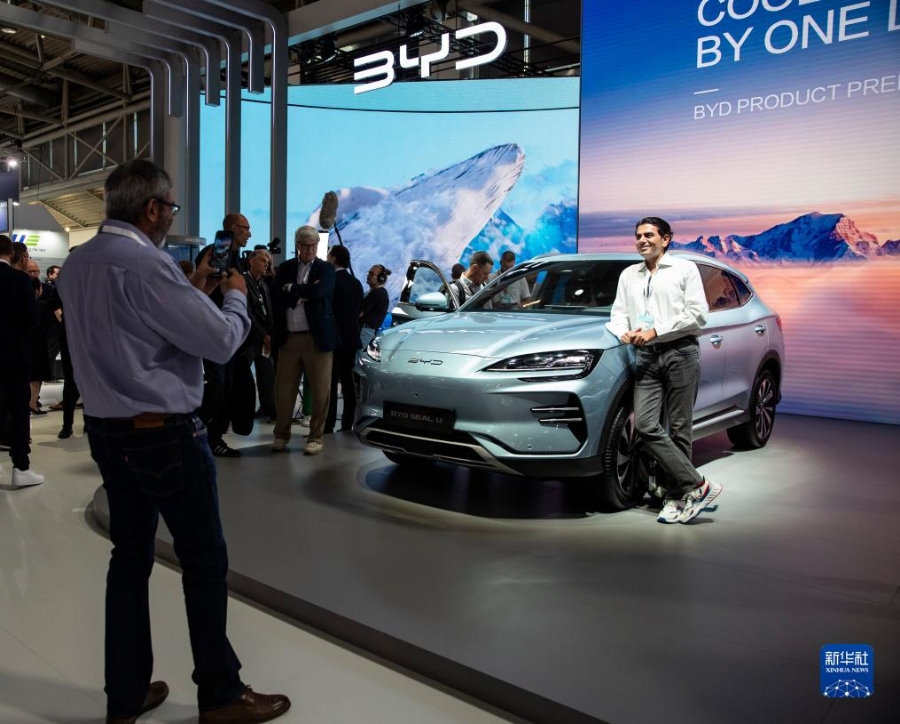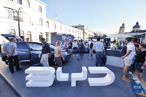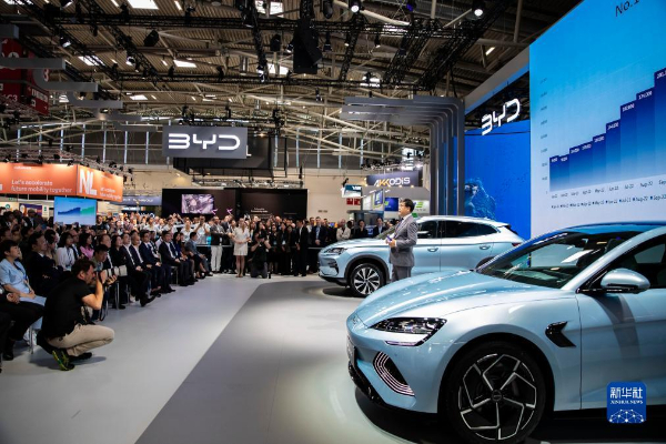 9月5日,人們?cè)诘聡?guó)慕尼黑國(guó)際車(chē)展的城市公共展示區(qū)參觀比亞迪汽車(chē)。