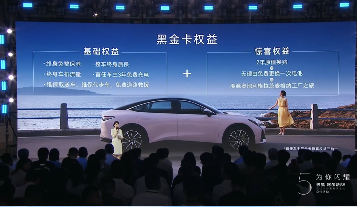 阿爾法S5交付的同時,“三巨頭”還為首批用戶帶來價值不菲的黑金卡權(quán)益,包括終身免費保養(yǎng)、首任車主3年免費充電、免費道路救援,以及2年原值換購、無理由免費更換一次電池、溯源奧地利格拉茨麥格納工廠之旅等實打?qū)嵉暮枚Y,并且此后還將定期抽取幸運用戶持續(xù)發(fā)放黑金卡權(quán)益,開創(chuàng)汽車行業(yè)交付價值感的新境界。