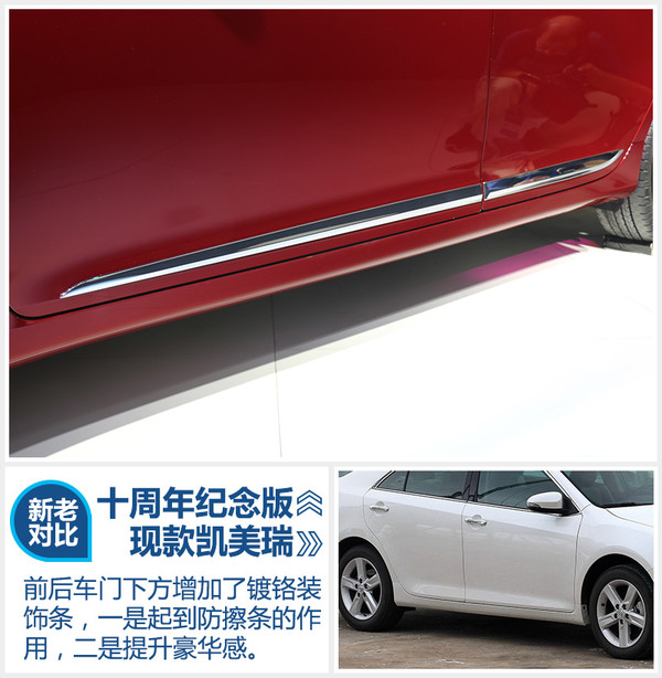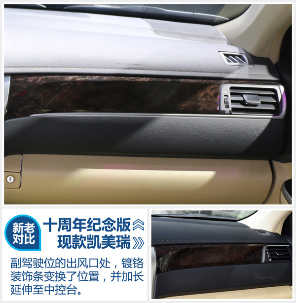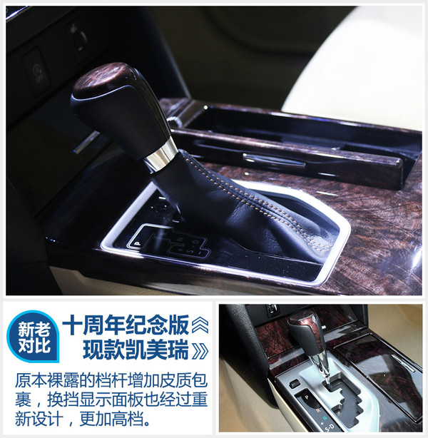 凱美瑞的“蛇形”換擋機(jī)制一直是筆者非常喜歡的設(shè)計(jì),最起碼在開車的時(shí)候不會(huì)因?yàn)閾Q錯(cuò)擋而發(fā)生意外碰撞。但是說實(shí)話,裸露的檔桿總覺得缺了點(diǎn)什么。十周年紀(jì)念版將檔桿周圍加上了皮質(zhì)包裹,立馬將中控臺的“氣質(zhì)”提升了一個(gè)檔次,筆者本人是非常喜歡的。另外,副駕駛面前的木紋面板也增加了一條鍍鉻裝飾。