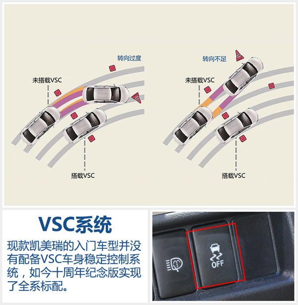 目前在售的現(xiàn)款凱美瑞入門版車型,并沒有配備VSC車型穩(wěn)定控制系統(tǒng),這對于預(yù)算有限的消費(fèi)者來說,原本可以成為購買目標(biāo)的凱美瑞,很有可能就因?yàn)檫@一個(gè)配置被篩掉了。如今,十周年紀(jì)念版實(shí)現(xiàn)了全系車型標(biāo)配VSC系統(tǒng)。