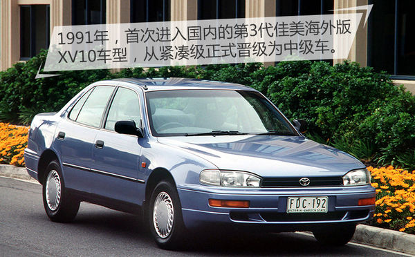 在5代之前,最先進(jìn)口引入國內(nèi)的是第3代佳美,這是非常具有歷史意義的一代車型,不但正式確立了佳美在豐田“全球車”陣營中的主力位置,還順帶打開了中國市場。首次進(jìn)入國內(nèi)市場的是第3代佳美(1991-1996)針對海外市場推出的XV10車型,與日本本土的V30不同,XV10從一輛緊湊級轎車“成長為”一輛B級車。