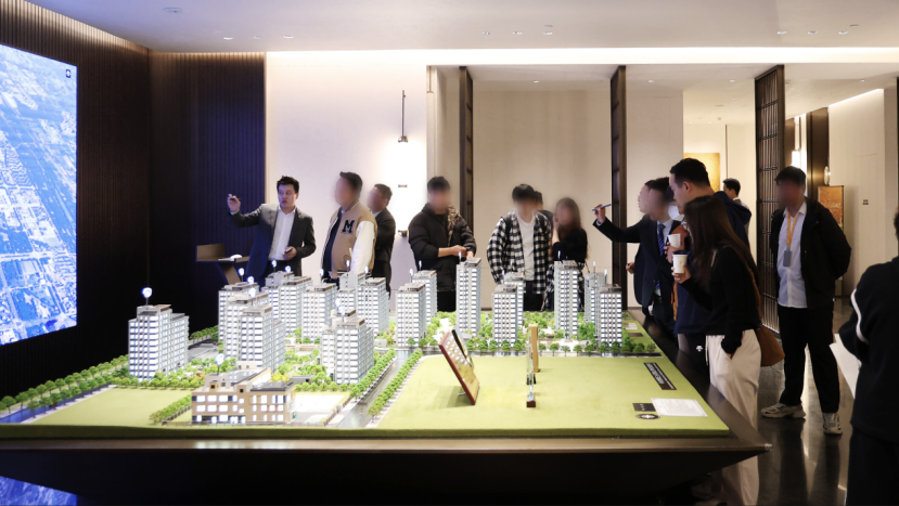 (北京房山區(qū)華潤京熙潤府售樓處沙盤前看房人群絡(luò)繹不絕)