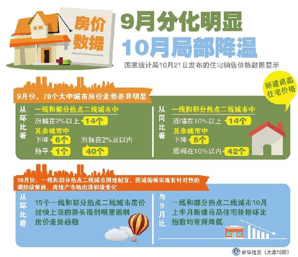 新華社北京10月21日電(記者王希)國家統(tǒng)計(jì)局21日發(fā)布的住宅銷售價(jià)格數(shù)據(jù)顯示,9月份70個大中城市房價(jià)分化明顯,10月份一線和部分熱點(diǎn)二線城市有針對性地實(shí)施調(diào)控政策,房地產(chǎn)市場明顯降溫。