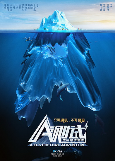 該款概念海報色彩清新,藍色的主色調(diào)充滿神秘之感。畫面中,冰山打造成的字母“A”字大膽奪目,預(yù)示著電影將由一場“A測試”展開;天與海之間不對稱的構(gòu)圖比例彰顯視覺張力,深不可測的海底寓意測試的未知性。此外,該款海報故事性十足,冰面上歡樂祥和的氛圍與海平面下變幻莫測的氣氛形成鮮明對比,這似乎在暗示愛情測試之路將危機四伏、充滿挑戰(zhàn)。