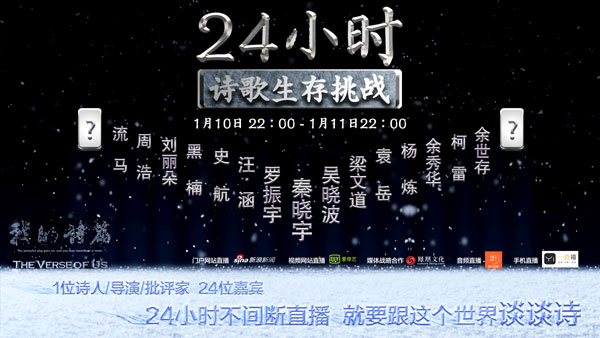 據(jù)了解,從1月10日晚22:00開始,秦導(dǎo)邀請了24位各界知名人士,24小時(shí)不間斷直播接力談詩歌。自媒體“羅輯思維”創(chuàng)始人羅振宇,著名財(cái)經(jīng)作家、財(cái)經(jīng)自媒體“吳曉波頻道”創(chuàng)始人吳曉波,國際著名詩人楊煉,香港著名文化人梁文道,湖南衛(wèi)視著名主持人汪涵,自媒體人袁岳,著名知識分子余世存,詩人余秀華,詩人、詩歌自媒體“讀首詩再睡覺”公號主編流馬,編劇史航,金馬獎(jiǎng)最佳紀(jì)錄片導(dǎo)演周浩,歐洲著名漢學(xué)家柯雷,著名音樂人黑楠等人,將通過現(xiàn)場、電話連線、視頻等多種方式參與本次在線直播活動(dòng),而鳳凰衛(wèi)視著名主持人曹景行、著名主持人崔永元以及詩歌評論家唐曉渡也有望一起參與。