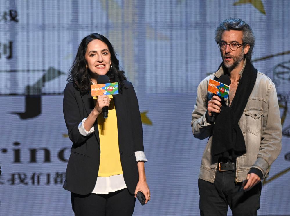 10月12日,在位于北京的中央歌劇院劇場,音樂戲劇《小王子》導(dǎo)演讓·貝洛里尼(右)、總制作人安娜出席發(fā)布會(huì)。新華社記者 金良快 攝