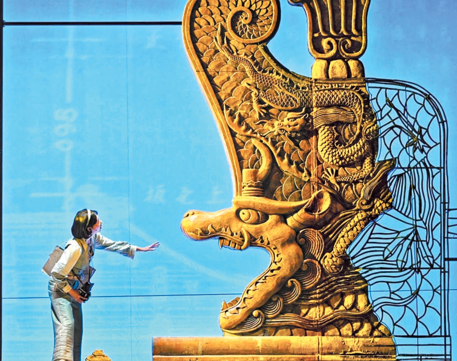 王琛透露,舞臺(tái)上關(guān)鍵的古建筑構(gòu)件均嚴(yán)格按照1∶1的真實(shí)比例復(fù)原制作,當(dāng)它們懸置于觀眾面前,一種視覺(jué)上的“沖擊力”油然而生,“觀眾能直觀體會(huì)到劇中人物每日工作的物理尺度和精神重量,體會(huì)測(cè)繪隊(duì)員是以怎樣的血肉之軀攀爬、丈量并挽留這份巍峨的文明?!蔽枧_(tái)地面,北平時(shí)期中軸線的建筑脈絡(luò)化為起伏線條,如紙張般弧形掀起,“寓意著古城文明在戰(zhàn)火中飄搖欲飛卻又根基深植的命運(yùn)。建筑的‘實(shí)’代表文明遺產(chǎn),圖紙的‘虛’代表傳承意志,虛實(shí)明暗的銜接過(guò)渡,共同凝固了那段驚心動(dòng)魄的歷史?!保ㄓ浾?高倩)