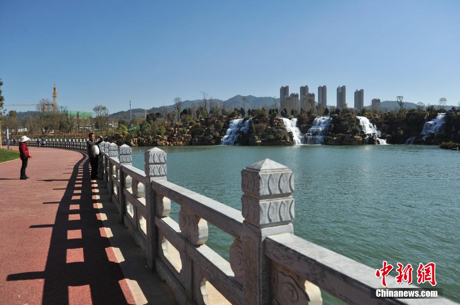 1月5日,游客在昆明瀑布公園內(nèi)游覽拍照。據(jù)了解,昆明瀑布公園1月1日開始對民眾開放,公園的瀑布利用牛欄江引水入滇工程而形成人工瀑布及湖泊,其利用約12.5米的地勢高差,建設(shè)成寬幅約400米的人工瀑布,是中國最大人工瀑布。 中新社記者 任東 攝