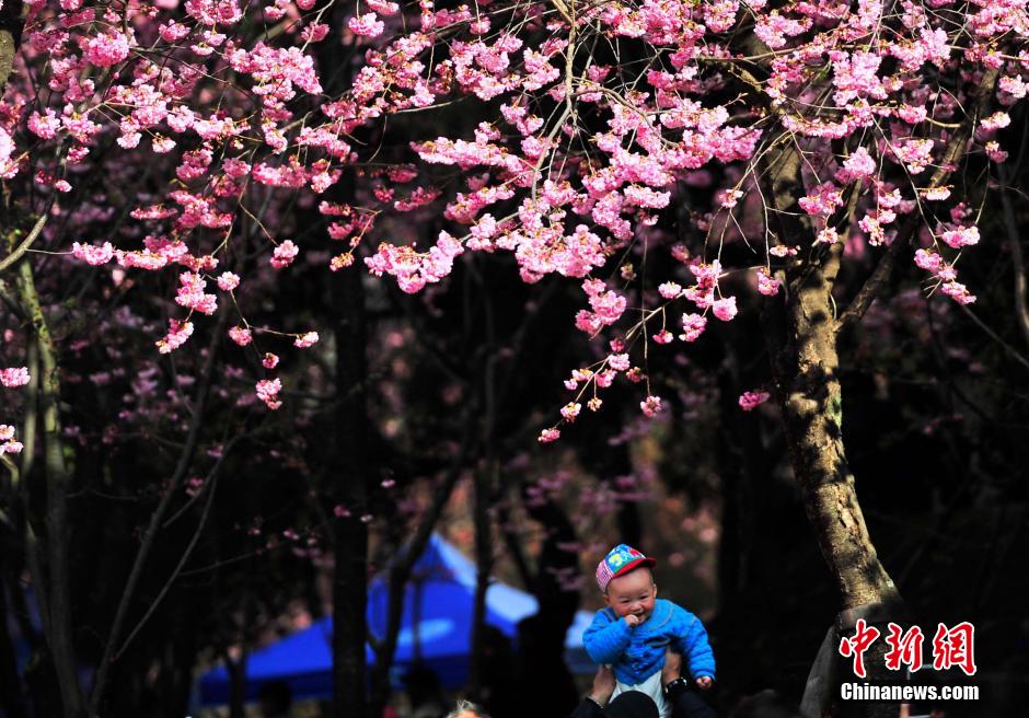 近日,昆明圓通山的櫻花和海棠花逐漸進入盛花期,引來眾多市民踏春趕花潮。圓通山工作人員介紹,受此前寒潮的影響,海棠和櫻花花期推遲,但顏色比往年更艷麗且花量增加。中新社記者 劉冉陽 攝