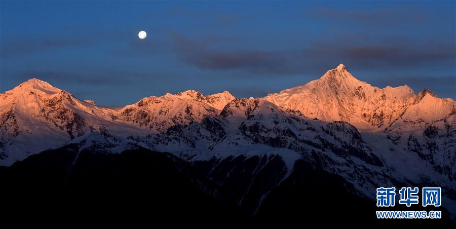這是3月25日清晨拍攝的梅里雪山“日月同輝”景觀。梅里雪山位于滇藏交界的云南省迪慶藏族自治州德欽縣境內(nèi),是世界自然遺產(chǎn)“三江并流”的主要自然景觀之一。梅里雪山常年云霧籠罩,太陽光只在少數(shù)天晴的清晨照射在雪山頂上,形成絕美的“日照金山”美景。有時月亮尚未落山,太陽已經(jīng)升起,更是形成了難得一見的梅里雪山“日月同輝”奇觀。新華社記者 王長山 攝