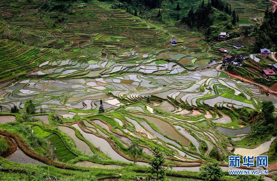 5月20日在廣西柳州市融水苗族自治縣桿洞鄉(xiāng)拍攝的梯田。廣西柳州市融水苗族自治縣桿洞鄉(xiāng)平均海拔780多米,是全縣高海拔鄉(xiāng)鎮(zhèn)之一。這里的梯田多在高山,人們稱之為“天上糧倉(cāng)”。時(shí)下,“天上糧倉(cāng)”或儲(chǔ)水待插,或新秧初栽,如織錦一般美不勝收。新華社發(fā)(龍濤 攝)