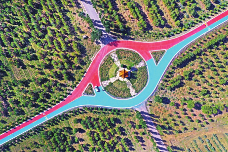 在得勝堡不遠(yuǎn)處,長城一號(hào)旅游公路蜿蜒而過。車行其上,仿佛置身于絢爛的畫卷之中,紅藍(lán)黃交織的道路色彩鮮艷;環(huán)顧四周,云海翻騰。長城驛站為游客提供休憩之所,路旁是遼闊的綠丘和連綿的樹林。