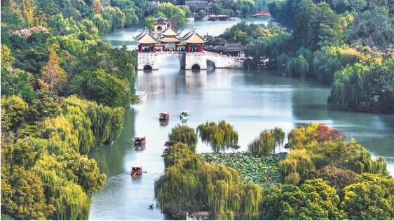 10月28日,游客在江蘇揚州瘦西湖風(fēng)景區(qū)游玩賞秋。金秋十月,神州大地色彩斑斕,秋色迷人。 新華社發(fā)(齊立廣 攝)