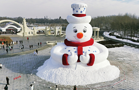 12月8日,哈爾濱今冬第一個(gè)大雪人“雪人先生”在太陽(yáng)島風(fēng)景區(qū)落成。大雪人高20米,用雪量4000立方米。圖為12月9日在哈爾濱太陽(yáng)島風(fēng)景區(qū)正門廣場(chǎng)拍攝的大雪人(無(wú)人機(jī)照片)。