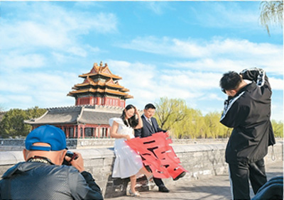 一對(duì)情侶在北京故宮角樓處拍攝新婚照片。新華社記者 李 賀攝