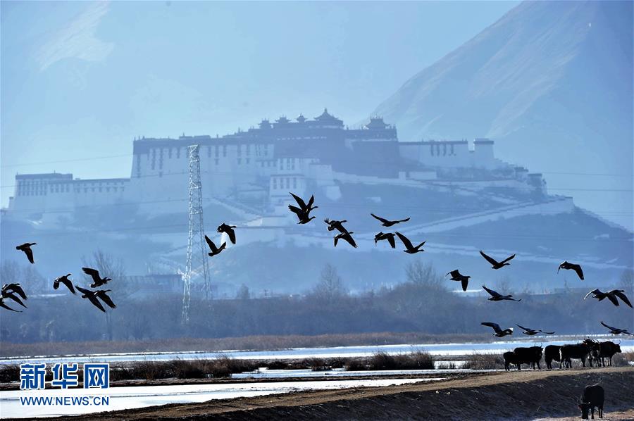 水鳥飛翔在拉魯濕地上空(1月7日攝)。入冬以來,位于拉薩城邊的拉魯濕地國家級自然保護區(qū)候鳥增多,斑頭雁、赤麻鴨、野鴨等數(shù)十種候鳥在這里過冬。拉魯濕地國家級自然保護區(qū)海拔3600多米,總面積12.64平方公里,是中國海拔最高、面積最大的城市天然濕地,被譽為“拉薩之肺”。新華社記者 張汝鋒 攝