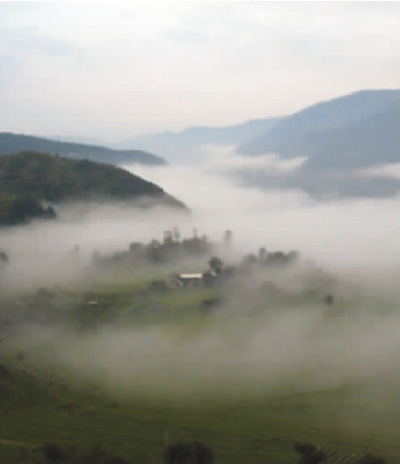 炊煙裊裊的村莊,偷偷地從薄霧里露出惺忪的臉來,時(shí)隱時(shí)現(xiàn),猶如傳說中的蓬萊仙島。一個(gè)個(gè)白族村莊沉浸在美輪美奐的仙境之中,整個(gè)峽谷布滿著一幅幅精美絕倫的淡墨山水畫??上У氖谴逯械娜藗冞€未品嘗出做神仙的滋味,霧海就隨著江面吹來的西風(fēng)越升越高,不一會(huì)兒,就向羅平山頂飄襲而來。我們幾個(gè)觀霧者迅即被淹沒在濃濃的云山霧海中,成了騰云駕霧的神仙了。遺憾的是我們還未過足神仙癮,那些飄蕩在山頂?shù)脑旗F就被熱烈而耀眼的太陽光收回去了,讓我們不得不回到人間,仍去做原來的凡夫俗子。