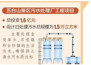 五臺山景區(qū)污水處理廠工程項(xiàng)目總投資1.6億元,設(shè)計(jì)日處理污水總規(guī)模為1.5萬立方米,主要處理金崗庫鄉(xiāng)、石咀鎮(zhèn)和臺懷鎮(zhèn)的生活污水,確保排入清水河水質(zhì)達(dá)標(biāo)。