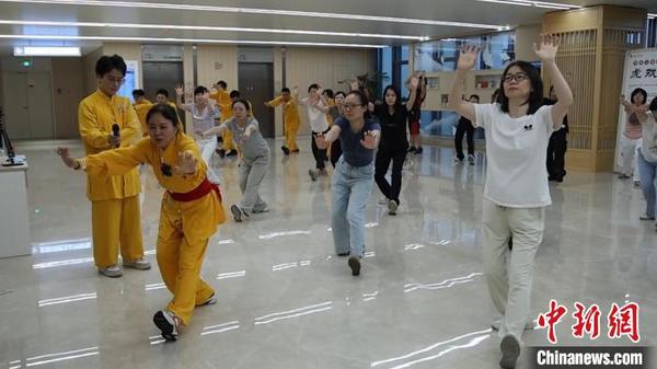 中新網(wǎng)杭州7月7日電 (張煜歡)“兩手向上、向前劃弧,隨即十指彎曲成虎爪,掌心向下……”近日,走進(jìn)浙江省立同德醫(yī)院一處古色古香的大廳內(nèi),數(shù)十位學(xué)員正跟著身著練功服的中醫(yī)專家認(rèn)真學(xué)習(xí)五禽戲。這是該醫(yī)院今年新開設(shè)的中醫(yī)養(yǎng)生夜校,通過傳授五禽戲、易筋經(jīng)、八段錦等中華養(yǎng)生導(dǎo)引術(shù),幫助市民有效鍛煉身體,達(dá)到祛病強(qiáng)身的效果。
