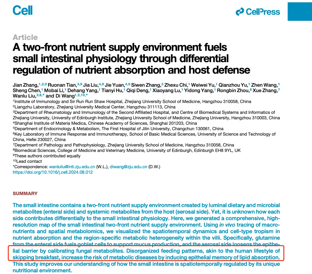 日前,浙江大學(xué)醫(yī)學(xué)院附屬邵逸夫醫(yī)院、浙江大學(xué)愛丁堡大學(xué)聯(lián)合學(xué)院、中國科學(xué)院上海藥物研究所的研究團隊,在頂尖學(xué)術(shù)期刊《細胞》(Cell)上合作發(fā)表一篇論文表明,不吃早餐的這種飲食習慣會改變小腸對營養(yǎng)物質(zhì)的吸收方式,從而會增加代謝性疾病的風險。
