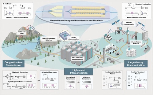 為此,北京大學(xué)聯(lián)合鵬城實(shí)驗(yàn)室、上海科技大學(xué)、國家信息光電子創(chuàng)新中心等研發(fā)團(tuán)隊(duì),創(chuàng)出“光纖—無線一體化融合通信”概念,并采用集成光學(xué)方案,成功研制出250GHz(千兆赫茲)以上超寬帶集成光子器件。在此基礎(chǔ)上開發(fā)出的新系統(tǒng)實(shí)現(xiàn)了光纖通信單通道512Gbps(千兆比特每秒)信號(hào)傳輸、無線通信單通道400Gbps信號(hào)傳輸。