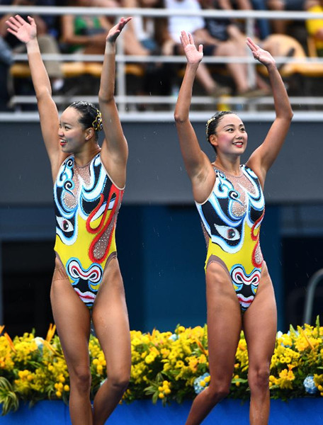 黃雪辰、孫文雁決賽中第8?jìng)€(gè)出場(chǎng),在她們前一位完成比賽的伊什琴科/羅馬什娜用幾乎完美的表現(xiàn)征服了裁判,獲得了98.5333的高分,總分為194.9910分。不過(guò)黃雪辰、孫文雁的表現(xiàn)也不遑多讓,伴隨著具有中國(guó)曲風(fēng)的背景音樂(lè)在泳池中翩翩起舞,最終獲得97分,以總成績(jī)192.3688分獲得亞軍。