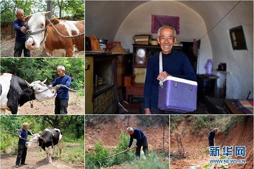 曹晉忠,男,1949年出生,山西省長治市武鄉(xiāng)縣鋪上村人。曹晉忠是村里的動(dòng)物防疫員,自己種了4畝玉米、2畝小米。因?yàn)槠拮映D昱P病在床,曹晉忠一家是該村的精準(zhǔn)扶貧對象。曹晉忠說,醫(yī)護(hù)人員經(jīng)常上門進(jìn)行健康狀況隨訪,駐村工作隊(duì)也常來家里幫忙,現(xiàn)在看病不發(fā)愁,干活有人幫,生活挺好的。 右上:曹晉忠肖像;左上、左中、左下:曹晉忠在給村里的牛做檢查;下中、下右:曹晉忠在地里干農(nóng)活(拼版照片,6月12日攝)。 地處晉東南的山西省長治市,位于由太行山、太岳山環(huán)繞而成的上黨盆地中。在群山中、崖壁上,許多村莊自然條件惡劣,基礎(chǔ)設(shè)施落后,脫貧致富是大山深處人們的迫切心愿。 近年來,一場場脫貧攻堅(jiān)戰(zhàn),在一個(gè)個(gè)深山村打響。政府全力探索脫貧路徑的同時(shí),山區(qū)百姓因地制宜,靠自己的雙手和智慧走上致富路,交出了一份扎實(shí)的脫貧答卷。 記者在太行山、太岳山一路尋訪,記錄下多位70歲老人的生活。這些共和國的同齡人,親歷了山鄉(xiāng)的巨變,見證著長治山區(qū)脫貧攻堅(jiān)偉大工程的一步步推進(jìn)。 新華社記者 詹彥 攝
