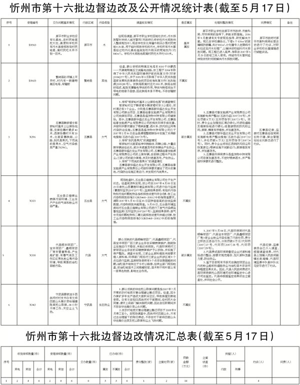 2017年5月14日晚,收到省群眾反映問(wèn)題處置組督辦的第十六批群眾反映問(wèn)題共計(jì)6件。其中重點(diǎn)案件4件。 我市高度重視,立即組織查處,截至5月17日,督辦的6件群眾反映問(wèn)題已辦結(jié)。其中,確認(rèn)屬實(shí)1件;確認(rèn)部分屬實(shí)2件;確認(rèn)不屬實(shí)3件。對(duì)于屬實(shí)和部分屬實(shí)已辦結(jié)的環(huán)保問(wèn)題,分別采取了相應(yīng)處理措施,共罰款14萬(wàn)元,對(duì)3名相關(guān)責(zé)任人進(jìn)行約談,對(duì)1名相關(guān)責(zé)任人進(jìn)行誡勉談話(huà)。對(duì)6件群眾反映問(wèn)題調(diào)查處理情況進(jìn)行了信息公開(kāi)。