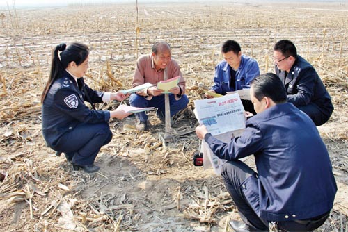 為了將《中華人民共和國(guó)大氣污染防治法》和《五臺(tái)縣人民政府嚴(yán)防森林火災(zāi)的通告》宣傳到戶、到人,五臺(tái)縣環(huán)保局組織工作人員,分組劃片深入到田間地頭,面對(duì)面讀報(bào)給農(nóng)民聽(tīng),為農(nóng)民解釋燒秸稈、燒荒等野外違規(guī)用火行為的危害。臺(tái)城鎮(zhèn)西關(guān)村66歲的農(nóng)民張存在說(shuō):“你們這樣解釋,咱懂。我家4畝地的秸稈保證不燒一根?!眻D為五臺(tái)縣環(huán)保局工作人員在田間地頭宣傳環(huán)境保護(hù)相關(guān)知識(shí)。(金俊賢 辛宇 攝影報(bào)道)