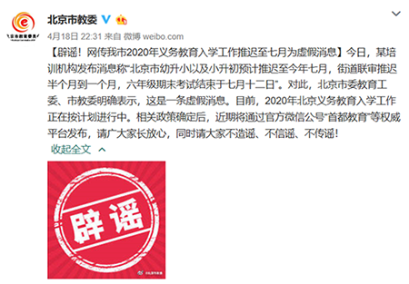 真相:北京市委教育工委、市教委明確表示,這是一條虛假消息。目前,2020年北京義務教育入學工作正在按計劃進行中。相關政策確定后,近期將通過官方微信公號“首都教育”等權威平臺發(fā)布。