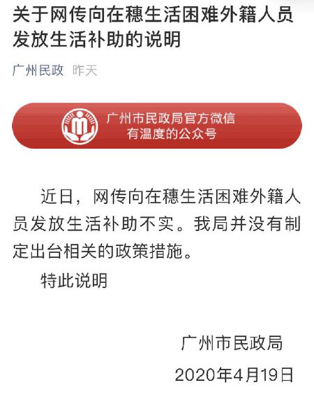 真相:廣州市民政局19日發(fā)表說明:近日,網傳向在穗生活困難外籍人員發(fā)放生活補助不實。我局并沒有制定出臺相關的政策措施。