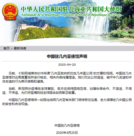 真相:4月20日,中國駐幾內亞使館通過官方網站發(fā)布聲明表示,使館對此高度重視并進行核實,相關內容純屬捏造。對此公然造謠、破壞中幾友誼和中非友誼的行為表示憤慨和譴責。