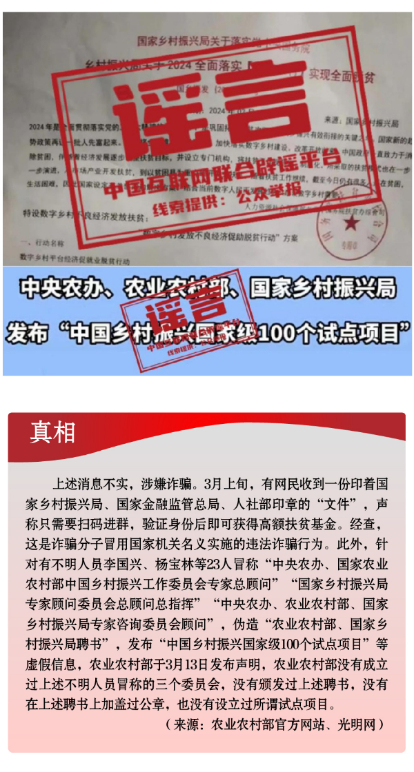 假冒權(quán)威杜撰政策類謠言,誤導公眾。3月以來,一些不法分子或機構(gòu)打著權(quán)威旗號,假冒國家機關、偽造政府公文、歪曲解讀政策,企圖行騙牟利。如,詐騙分子冒用國家機關名義,假稱“國家發(fā)放2024年鄉(xiāng)村振興扶貧補貼”“鄉(xiāng)村振興項目有國家級試點100個”“‘退稅綠色通道’加快退稅到賬速度”等,實施違法詐騙行為,給社會公眾造成極大信息和資金安全風險。還有人制造、傳播“我國城鄉(xiāng)居民醫(yī)保參保人數(shù)近年來持續(xù)下降,部分地區(qū)農(nóng)村出現(xiàn)醫(yī)保退保潮”“失業(yè)保險金只能領一次,最多領24個月”“我國社?;鹑冀唤o外資機構(gòu)管理”等一系列與事實嚴重不符的涉公共謠言,迷惑性大、蠱惑性強,極易誤導公眾,對我國現(xiàn)有社保政策和相關工作造成負面影響。