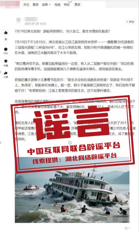 真相:近日,有網(wǎng)民發(fā)布“湖北宜昌游船突然倒扣,30人墜江”的圖文信息。經(jīng)海事部門核實(shí),網(wǎng)傳信息系謠言。經(jīng)查,轄區(qū)未發(fā)生類似事故,且無(wú)注冊(cè)船名為“三峽觀光6號(hào)”的船舶。(來(lái)源:“湖北網(wǎng)絡(luò)辟謠”微信公眾號(hào)、宜昌辟謠)