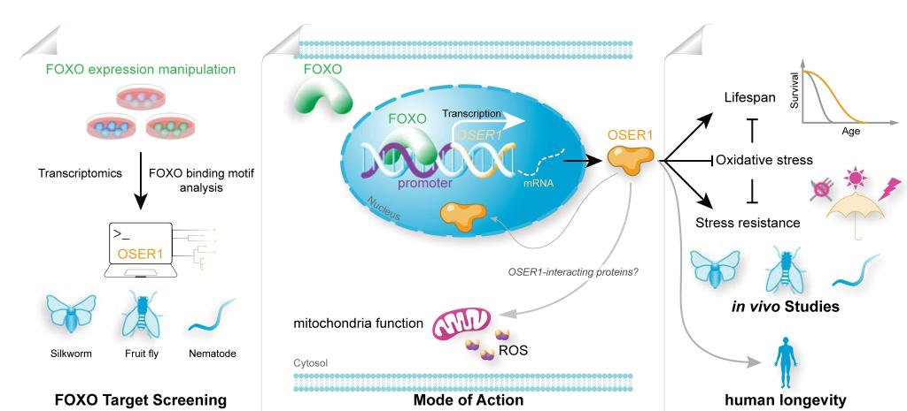 為了闡釋OSER1調(diào)節(jié)長(zhǎng)壽的作用機(jī)制,研究團(tuán)隊(duì)在家蠶、線蟲和果蠅中進(jìn)行了一系列的分子生物學(xué)實(shí)驗(yàn)。研究結(jié)果共同表明,OSER1是叉頭框蛋白O的直接靶基因,OSER1能夠響應(yīng)過(guò)氧化氫誘導(dǎo)的氧化應(yīng)激,并通過(guò)提升機(jī)體氧化應(yīng)激防御力發(fā)揮延長(zhǎng)壽命的作用。