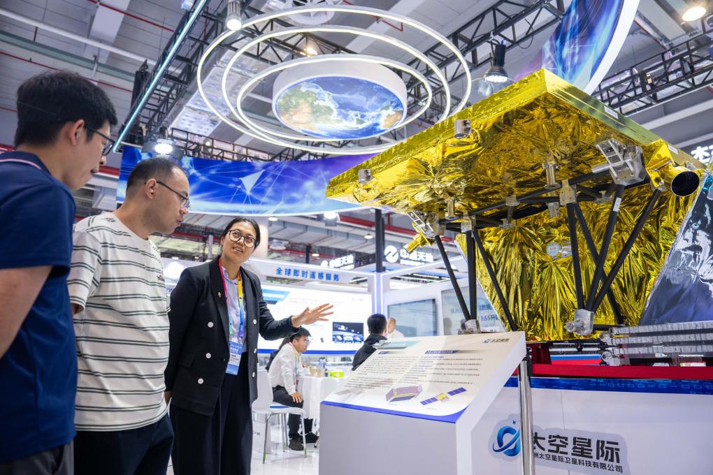 9月24日,第四屆北斗規(guī)模應(yīng)用國際峰會在湖南株洲開幕。圖為在株洲國際會展中心,工作人員(左三)在介紹一臺對地觀測衛(wèi)星。新華社記者 陳思汗 攝