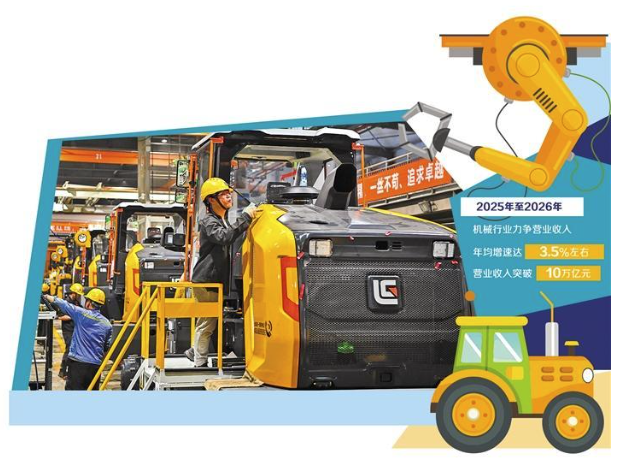 《方案》提出,2025年至2026年,機械行業(yè)運行保持平穩(wěn)向好態(tài)勢,重點產業(yè)鏈供應鏈韌性和安全水平持續(xù)提升,發(fā)展質量效益邁上新臺階,力爭營業(yè)收入年均增速達到3.5%左右,營業(yè)收入突破10萬億元。中國機械工業(yè)聯(lián)合會相關負責人表示,《方案》的目標設定,體現(xiàn)了規(guī)模與質量并重的系統(tǒng)性思維,強調供給和需求兩側協(xié)同發(fā)力。