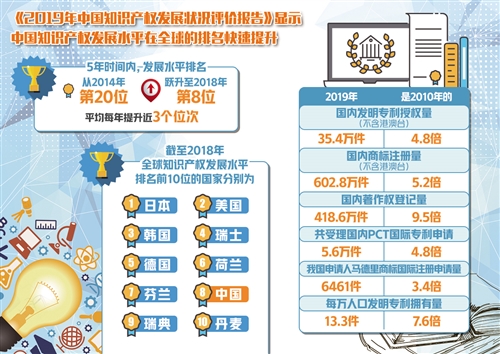 9月14日,中國(guó)國(guó)家知識(shí)產(chǎn)權(quán)局知識(shí)產(chǎn)權(quán)發(fā)展研究中心發(fā)布的《2019年中國(guó)知識(shí)產(chǎn)權(quán)發(fā)展?fàn)顩r評(píng)價(jià)報(bào)告》顯示,中國(guó)知識(shí)產(chǎn)權(quán)發(fā)展水平在全球的排名快速提升,短短5年時(shí)間內(nèi),排名已從2014年的第20位,快速躍升至2018年的第8位,平均每年提升近3個(gè)位次。