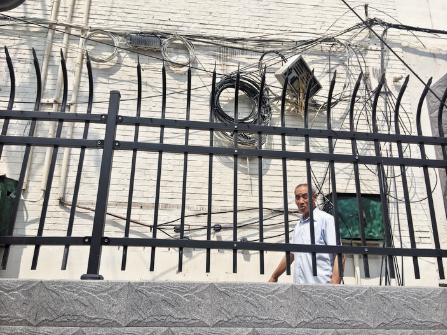記者在位于該路口的市化工局宿舍樓側(cè)面墻上看到布滿“蛛網(wǎng)”般的電線,藕斷絲連,錯綜復(fù)雜。小區(qū)住戶劉大爺告訴記者,這堵墻上的電線種類繁多復(fù)雜,最要緊的是其中的高壓電線固定在距離地面只有1米至1.5米左右的墻上,電線外面的PVC保護(hù)管已經(jīng)因年久失修嚴(yán)重老化,電線直接裸露在外,遇上下雨打雷天氣非常危險,平時小孩玩耍路過也不安全。據(jù)記者觀察,在距離這堵墻約兩米的地方有1根電線桿,宿舍樓墻上離地面最近的4根黑色電線就是從這根電桿上接進(jìn)來的,電線橫搭部分基本暴露在外,特別不安全。小區(qū)居民希望相關(guān)部門能夠盡快消除隱患,給居民們一個安全放心的居住環(huán)境。