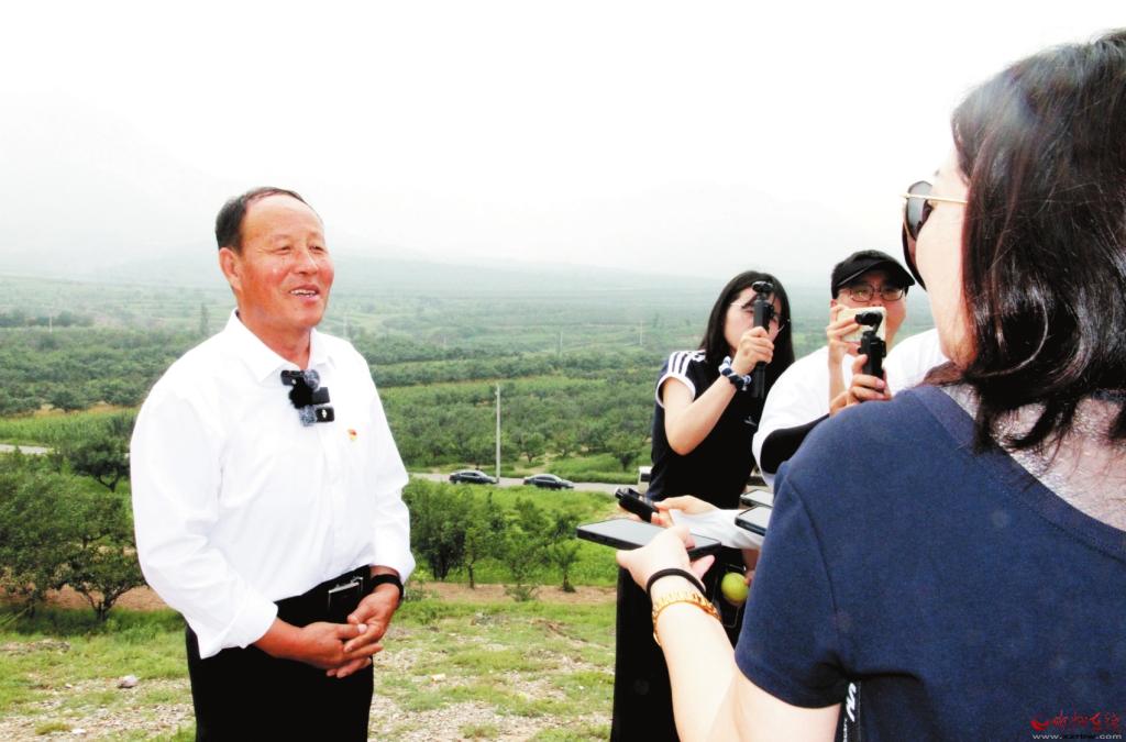 在萬畝玉露香酥梨基地觀景臺(tái)上,栗翠田(左一)接受“三晉人大代表采風(fēng)行”記者采訪張林泉攝
