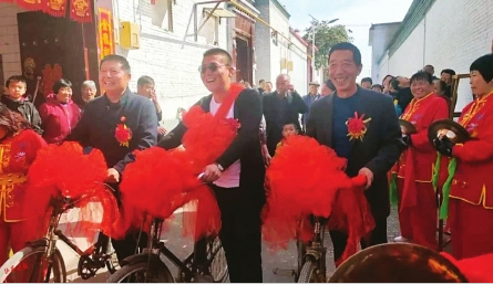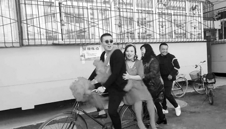 幾天前,這首“騎單車”歌曲里的情景,在太原市小店區(qū)小店街道杜家寨社區(qū)的一場(chǎng)婚禮上再現(xiàn)——新郎幸福地蹬著單車,后座上,美麗的新娘穿著紅色婚紗,甜蜜地靠在新郎背上,他們穿過社區(qū),在沿途眾多鄉(xiāng)鄰、親友的喝彩聲、祝福聲中,舉行了一場(chǎng)特別的單車婚禮。