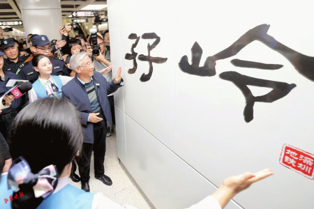 崗廈北站是深圳交通網(wǎng)絡(luò)中的重要節(jié)點,設(shè)計獨具匠心,通過天井將陽光引入地下,科技感和藝術(shù)性兼具,被譽為“深圳之眼”。在崗廈北站樞紐的“深圳之眼”下,姥爺即興揮毫,寫下“情滿鵬城”“厚德載運,深鐵為民”。墨跡未干,照片已登上熱搜。