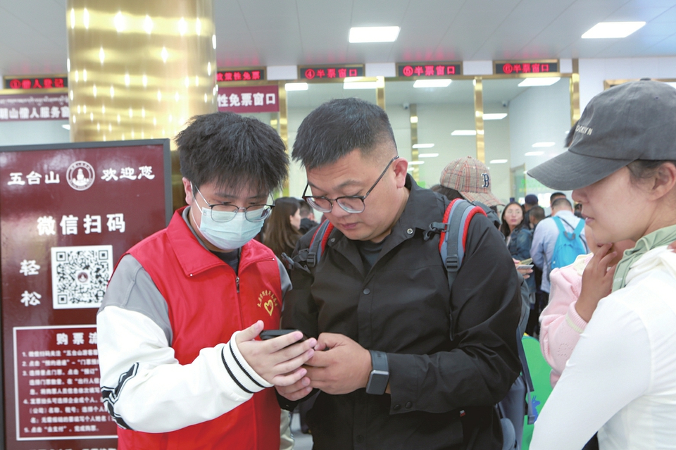 五臺山游客服務(wù)中心大廳內(nèi),志愿者正在協(xié)助游客網(wǎng)上購票。李春澤攝