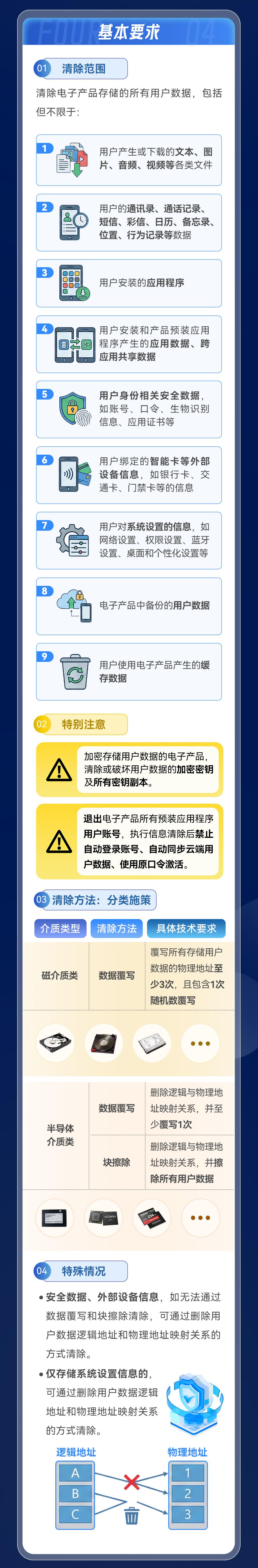 這項強制性國家標準的適用范圍涵蓋了在我國境內(nèi)生產(chǎn)、銷售的各類具有非易失性存儲介質(zhì)的電子產(chǎn)品,包括手機、平板電腦、筆記本電腦、臺式計算機,以及智能穿戴設備、辦公設備等。其約束對象既包括電子產(chǎn)品制造商、技術服務提供方,也包括二手電子產(chǎn)品回收經(jīng)營者。