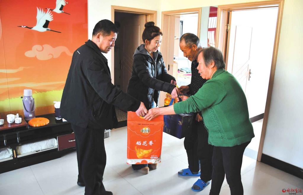 春節(jié)期間,五臺(tái)縣北一村到村工作大學(xué)生趙雪婷(左二)自費(fèi)購(gòu)買大米、食用油、牛奶等,和村委會(huì)干部來(lái)到78歲退伍軍人王還吉家中進(jìn)行慰問(wèn),并與老人促膝談心,鼓勵(lì)剛經(jīng)歷喪子之痛的老兩口振作起來(lái),好好生活。(王金龍 攝)