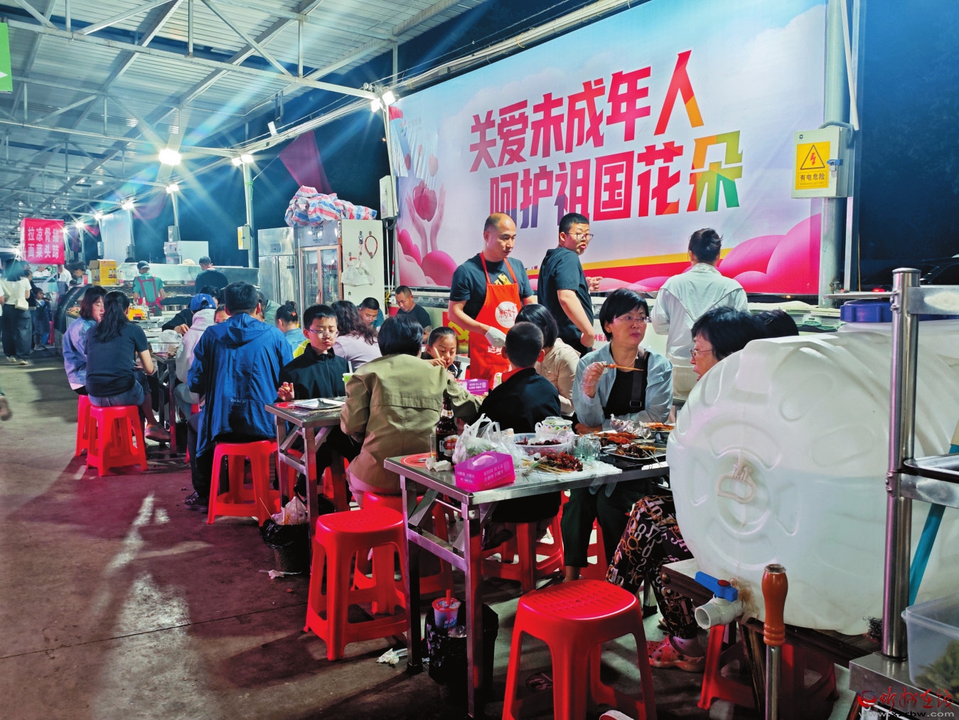 這場夜市盛宴里,“熱辣滾燙”的不僅是孫正偉的燒烤攤。馬大姐臭豆腐攤前總有來來往往的食客等待,已是兩鬢花白的徐師傅則以色香味俱全的炸串贏得客人稱贊;戴眼鏡的小哥也不甘寂寞,鐵板魷魚在他的手中美味生香……在特色小吃美食的周圍是慕名而來的市民,他們或三五好友小坐,或游走品嘗,共同交織成夏夜里最動人的“煙火氣”?!耙故胁粌H為我們提供了一個方便品嘗各種美食的生活圈子,更重要的是讓我們感受到了城市的‘煙火氣’,生活得更加放松、更加自在?!币故袗酆谜咄鯊娙缡翘寡?。