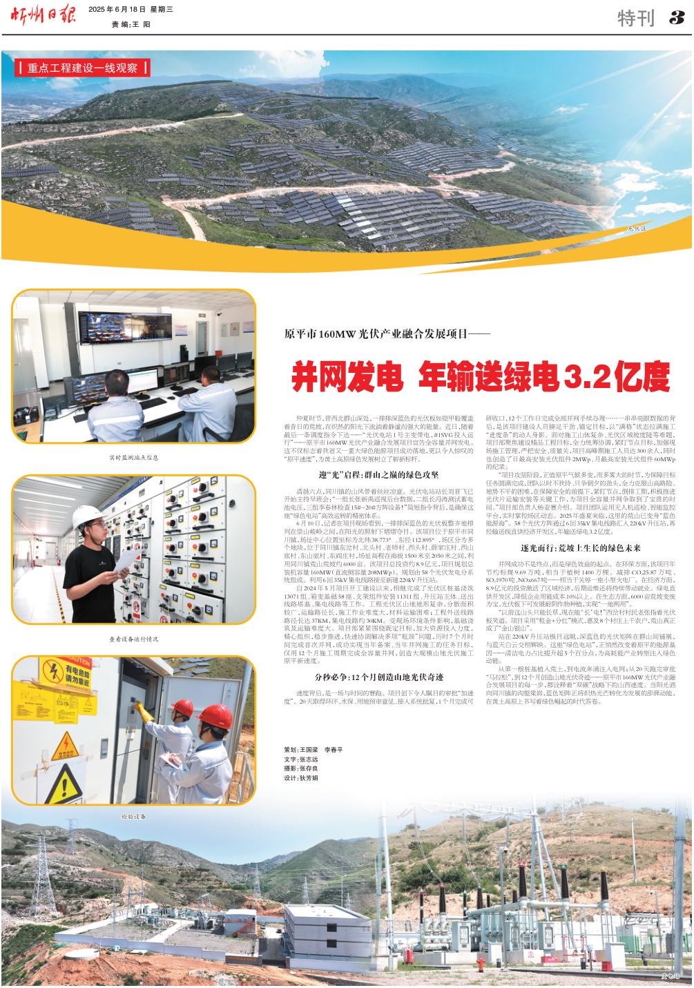 “項目攻堅階段,正值原平氣候多變,雨多霧大的時節(jié),為保障目標任務圓滿完成,團隊以時不我待、只爭朝夕的勁頭,全力克服山高路險、地勢不平的困難,在保障安全的前提下,緊盯節(jié)點,倒排工期,積極推進光伏片運輸安裝等關(guān)鍵工作,為項目全容量并網(wǎng)爭取到了寶貴的時間。”項目部負責人楊亞賽介紹。項目團隊運用無人機巡檢、智能監(jiān)控平臺,實時掌控場區(qū)動態(tài)。2025年盛夏來臨,這里的荒山已變身“藍色能源?!薄?8個光伏方陣通過6回35kV集電線路匯入220kV升壓站,再經(jīng)輸送線直供經(jīng)濟開發(fā)區(qū),年輸送綠電3.2億度。