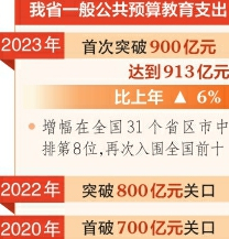 本報訊(記者任志霞)4月3日,記者從省財政廳獲悉,2023年我省一般公共預算教育支出首次突破900億元,增幅在全國31個省區(qū)市中排第8位,再次入圍全國前十。