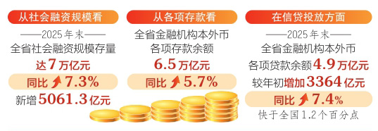 從社會融資規(guī)??矗?025年末,全省社會融資規(guī)模存量達(dá)7萬億元,同比增長7.3%;新增5061.3億元。其中,投向?qū)嶓w經(jīng)濟(jì)的本外幣貸款和政府債券凈融資增量合計(jì)占全部社融增量的94.4%。